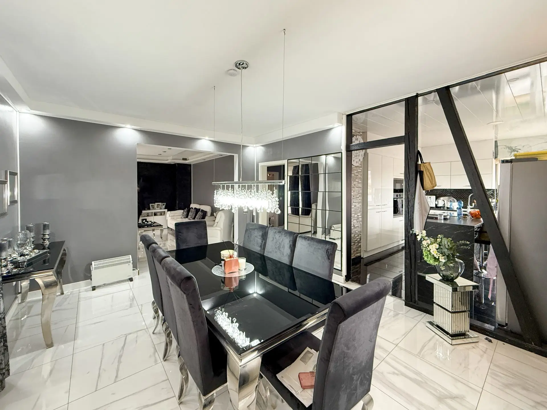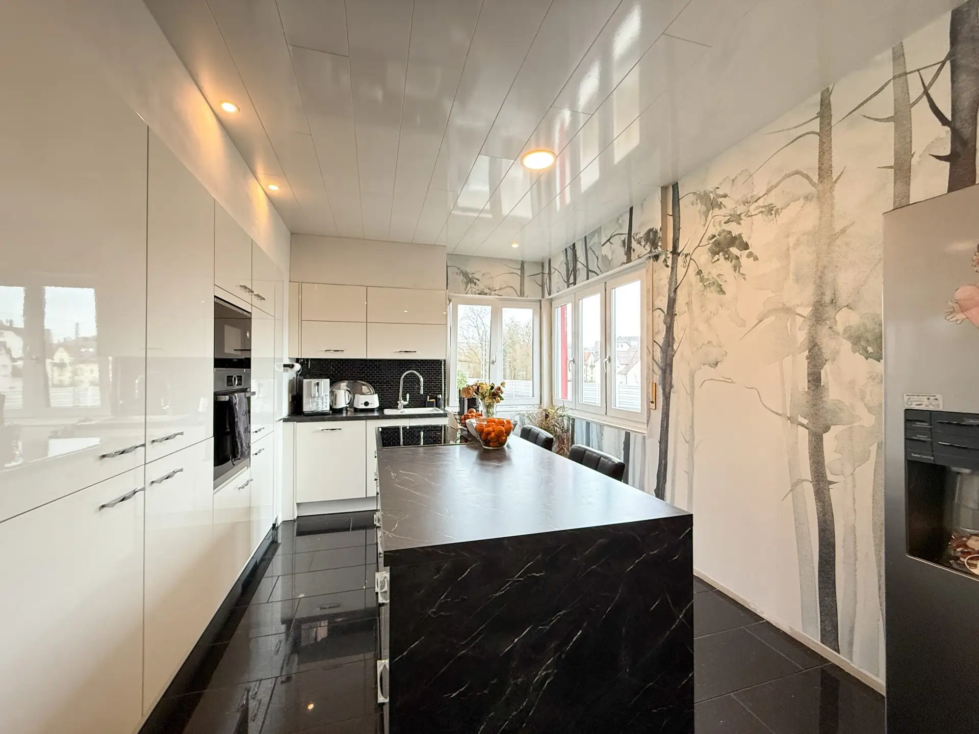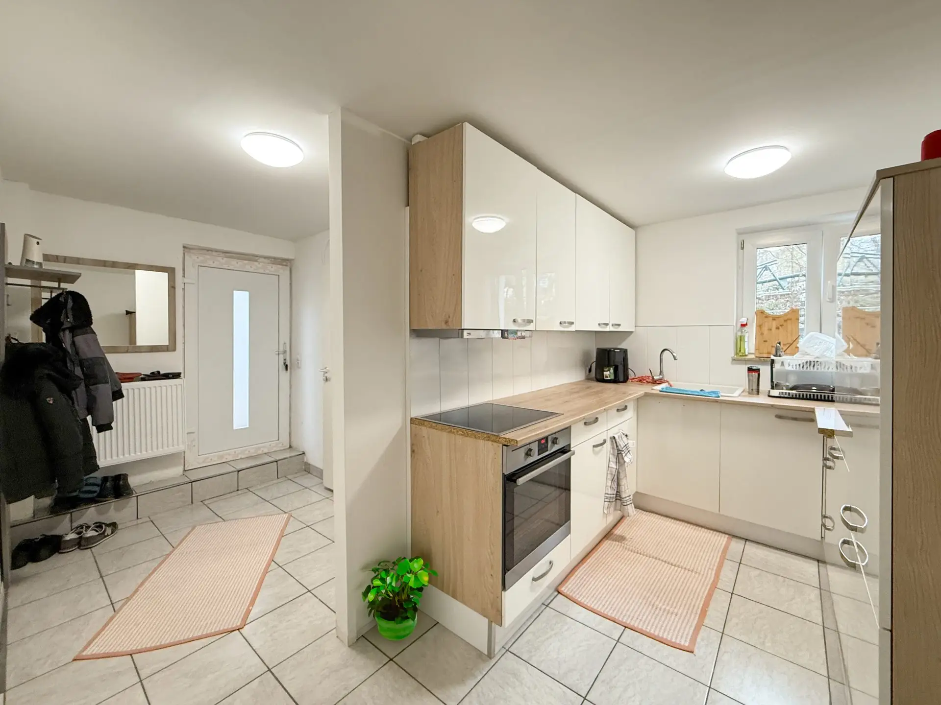 •Erdgeschoss: Moderne Einbauküche mit Essbereich, Wohnzimmer, ein Schlafzimmer, ein Gäste-WC und ein Badezimmer.